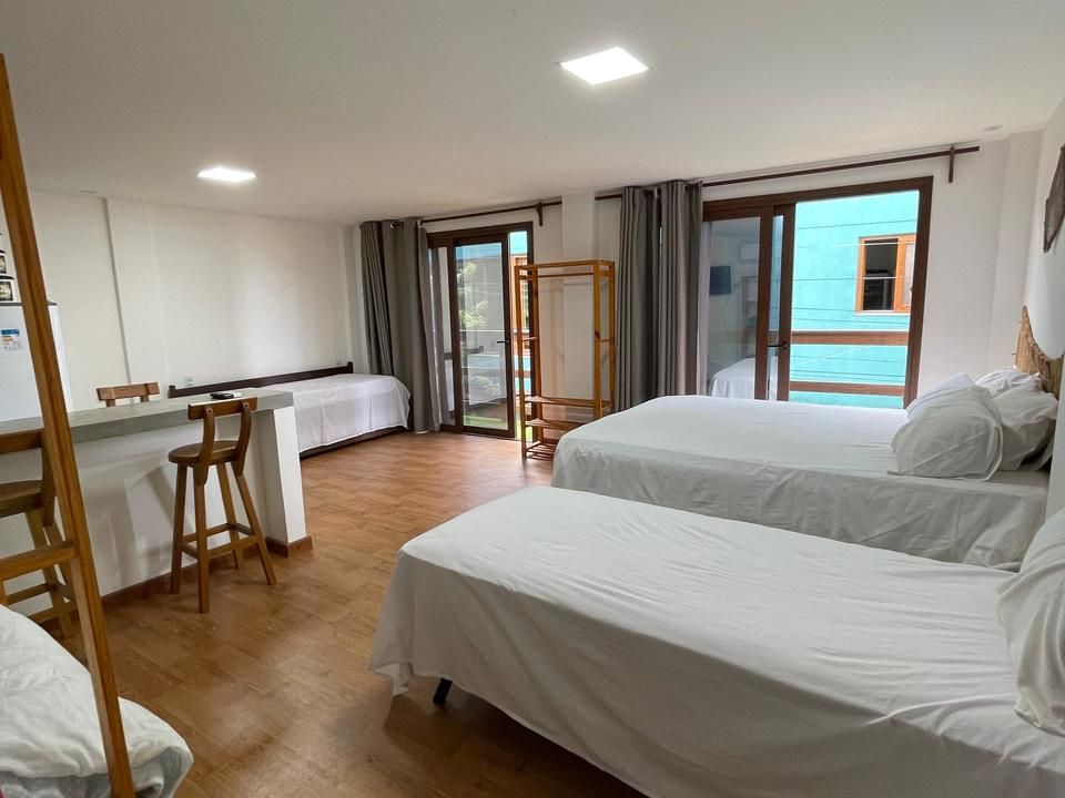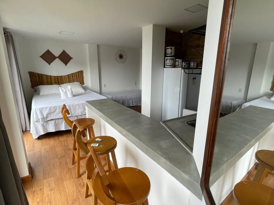 Acomoda até 3 pessoas, possui uma cama casal king, 1 cama solteiro, flat com cozinha completa, roupas de cama.
