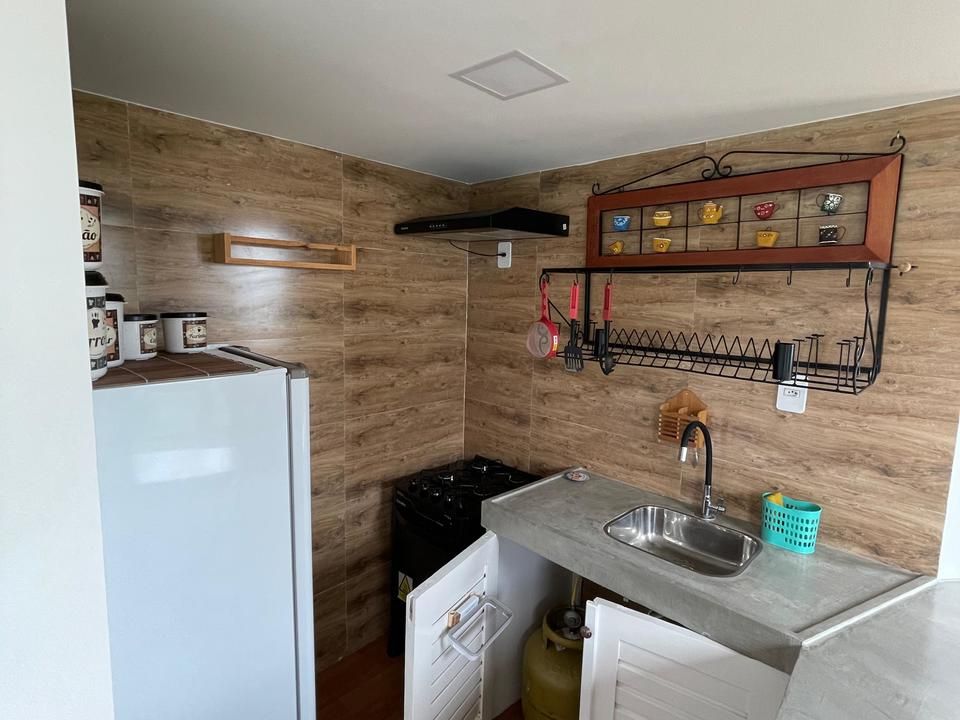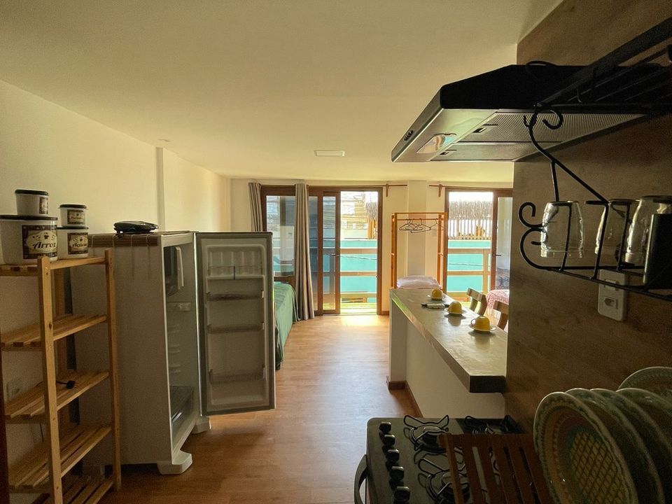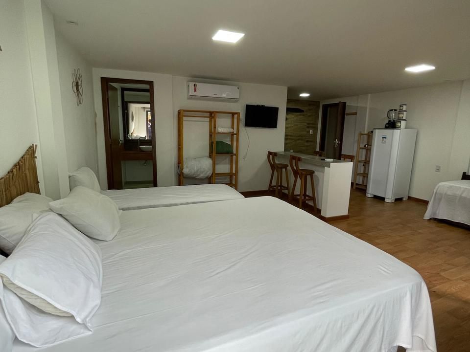 acomoda até 3 pessoas, possui uma cama casal king, 1 cama solteiro, flat com cozinha completa, roupas de cama e uma vista incrível para primeira praia e farol do morro.